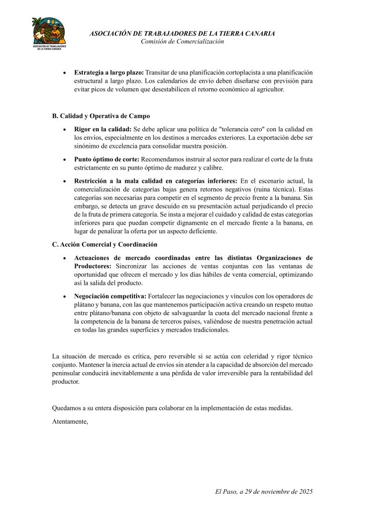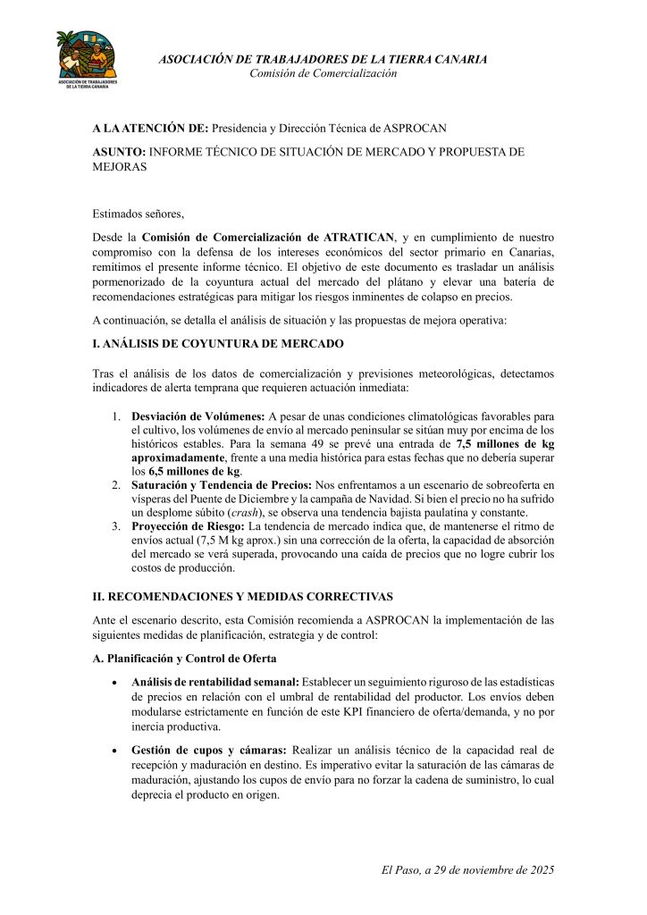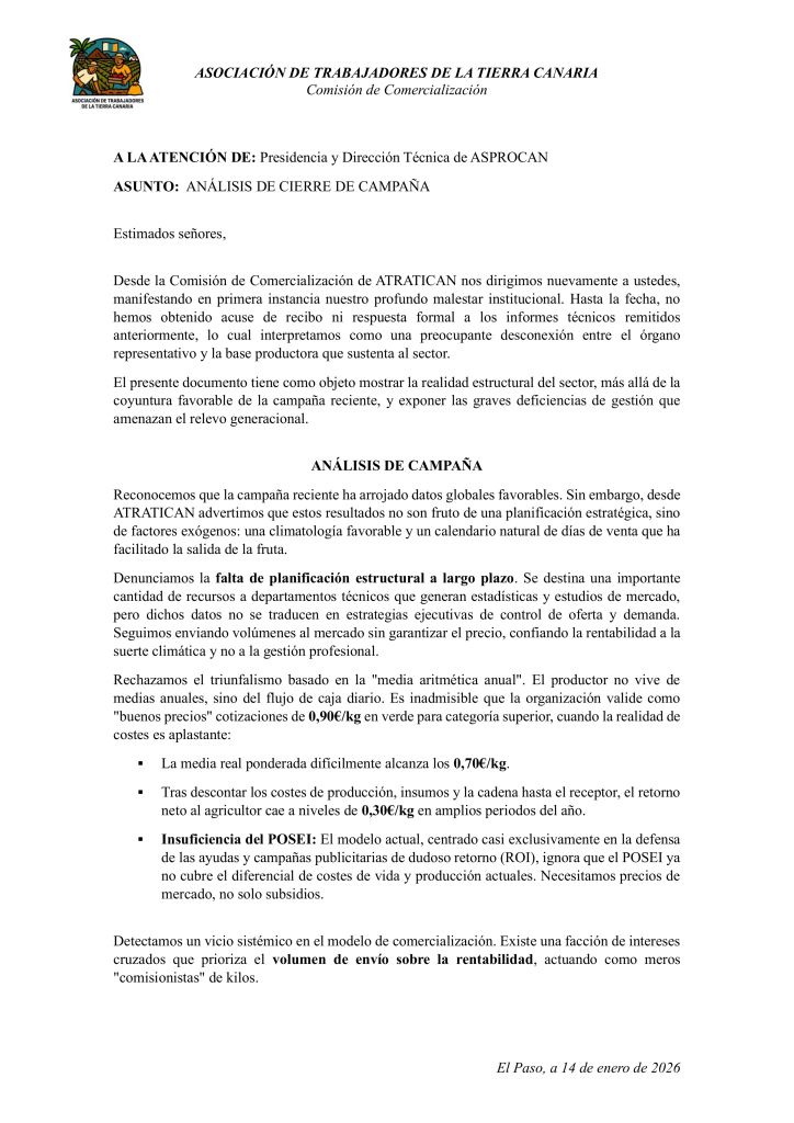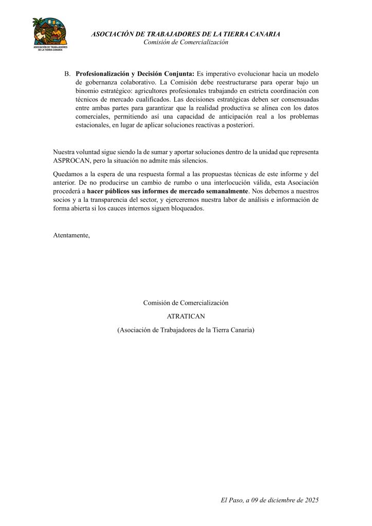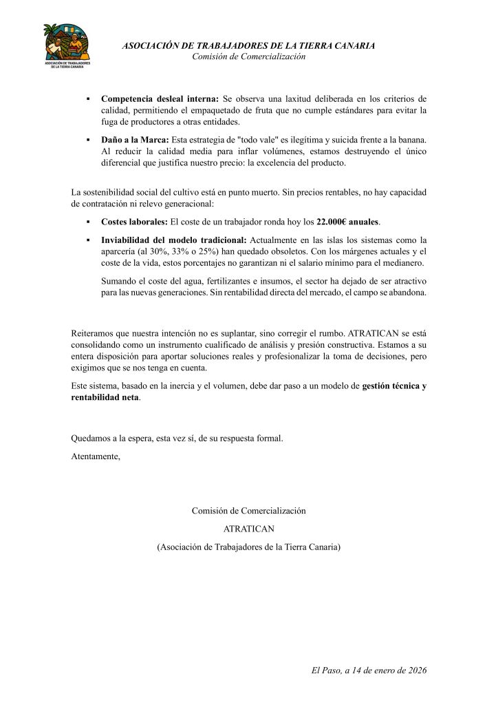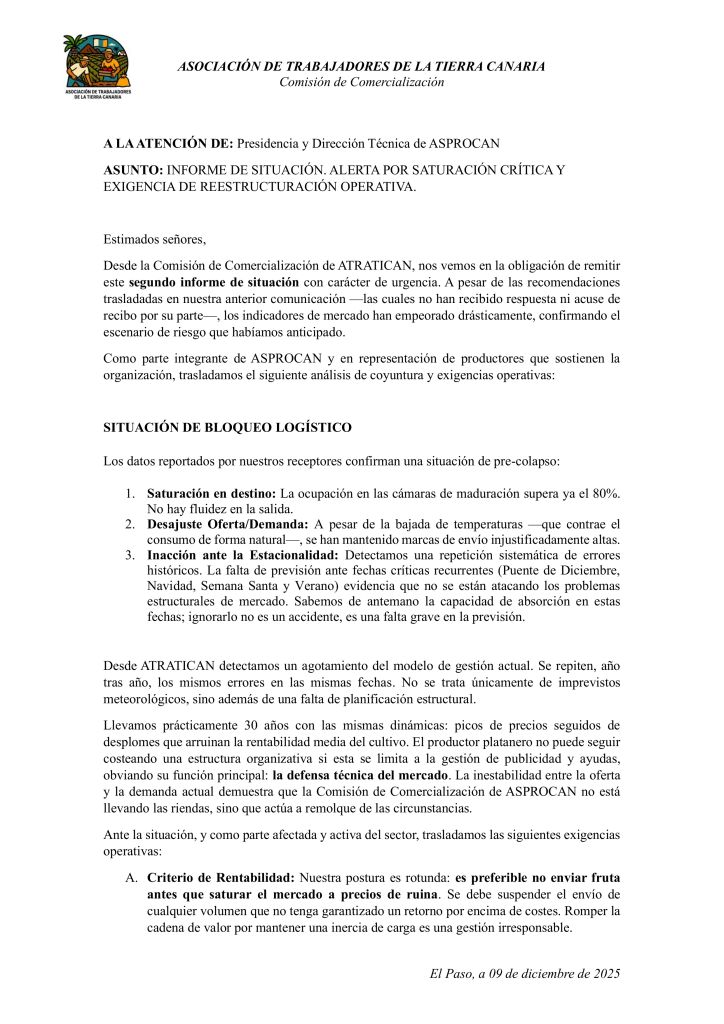 En un informe fechado el 14 de enero, expresa su “profundo malestar” con la Asociación de Productores de Plátano de Canarias (ASPROCAN), a la que ha remitido ya, con este, tres informes, desde noviembre pasado, sin que haya recibido respuesta alguna para abordar la manera de “corregir el rumbo”.